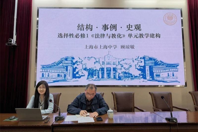 2026年4月7日下午,上海市教师教育学院组织的“分享·共进”教研经验交流活动(第八场)在上海市普陀区教育学院举行,来自上海市各区初、高中的历史骨干教师与会交流学习。在本次市级教研活动中,本部历史组顾琼敏老师进行了题为“结构·事例·史观——选必1‘法律与教化’单元的教学建构”的经验分享。(“分享·共进”教研经验交流活动现场)顾琼敏老师紧密依托“活用历史叙述,锚定内容要求”的交流主题,对“法律与教化”单元的三节课进行了细致的课标解读与文本分解,...