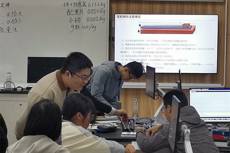 11月26日,尹云鹏老师在逸夫楼DIS实验室开展了《探究物体加速度和物体质量的关系》公开课。本节课的主要内容是通过定量的DIS实验探究在物体所受合力不变的情况下加速度和质量的关系,要求学生运用数字化信息系统测量实验数据,并通过逻辑推理分析得到实验结果。尹老师首先通过货轮启航、蜻蜓起飞以及刘翔起跑的情景引导学生思考影响物体加速度的因素,激发了学生们强烈的兴趣。然后,在尹老师的指导下,学生们讨论了实验方案以及其中可能会发生的问题。...