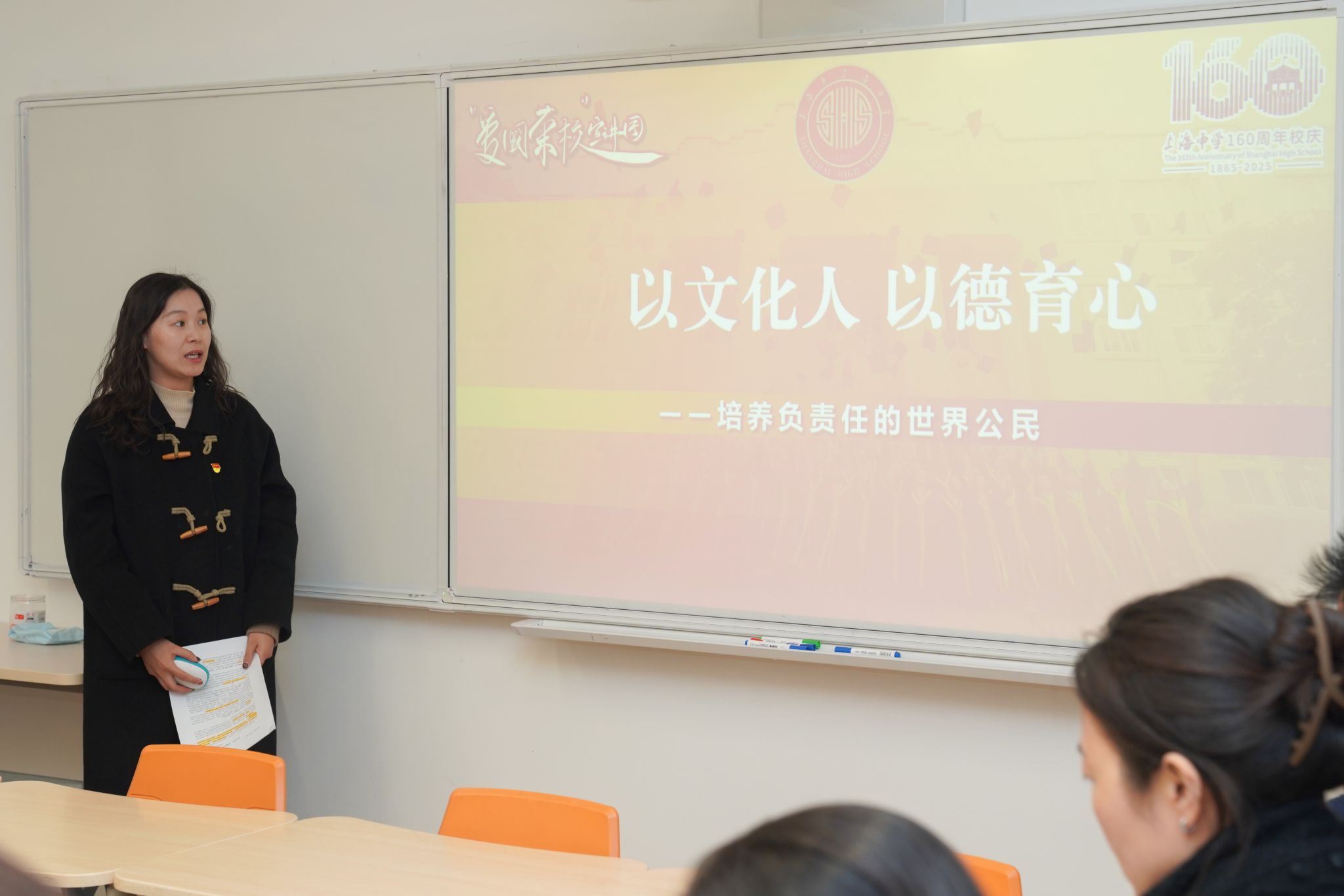 11月26日,国际部第四支部在先棉堂209教室组织举办了主题为“上承中西育桃李,汇爱润心启英才”的党日活动。本次活动特别邀请上汇实验学校爱国荣校宣讲团成员王婷淇老师作专题宣讲,第四支部全体党员齐聚一堂,共同聆听、学习与交流。王婷淇老师以《上承中西育桃李,汇爱润心启英才》为题,分为两个篇章为全体党员带来了一场内容丰富、思想深刻的讲座。讲座首先回顾了上汇实验学校在2015至2021年间,如何积极汲取国际先进教育理念的精华为我所用,...