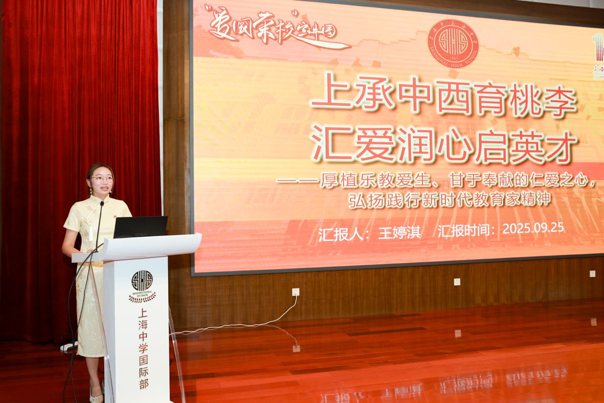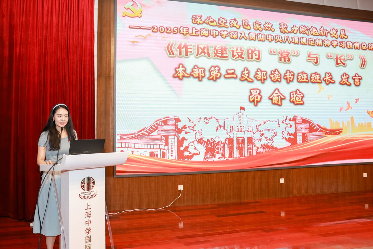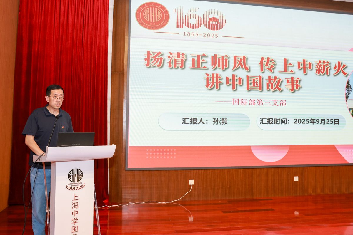 国际部第三支部书记孙灏老师以《扬清正师风 传上中薪火 讲中国故事》为题,从深学细悟筑牢思想根基,传承教育家精神弘扬上中薪火,以查促改讲好中国故事三方面汇报实践工作,并抒发继续以中央八项规定精神为指引,助力培养中国情怀、世界眼光的新时代人才的决心。