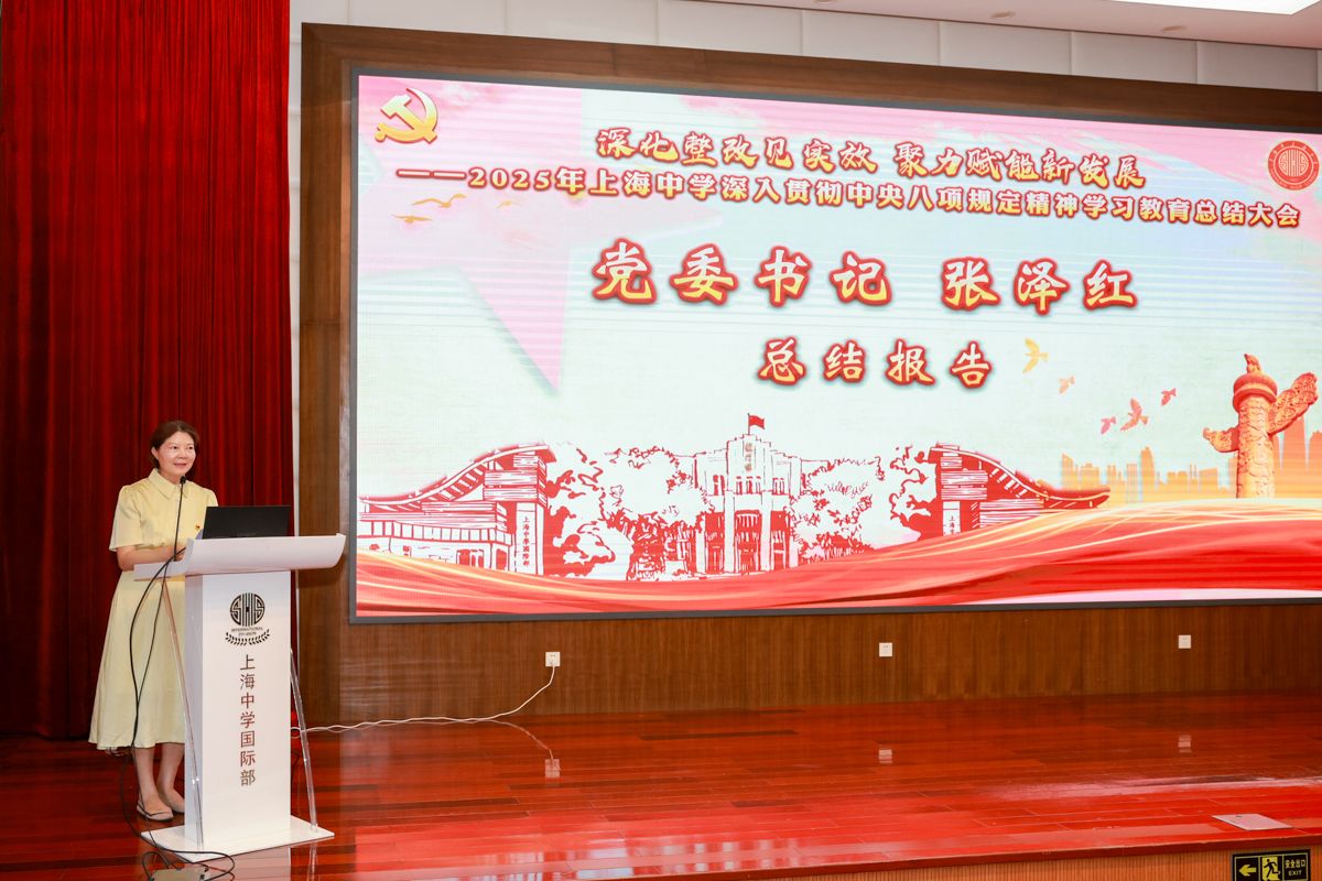 大会上,党委书记张泽红做上海中学深入贯彻中央八项规定精神学习教育总结报告。2025年3月起,上海中学在市教卫工作党委的指导下,积极开展深入贯彻中央八项规定精神学习教育,党委带领全体党员完成学习研讨、问题查摆、集中整治、开门教育各项任务,并以本次大会总结成果、交流体会,推动作风建设常态化长效化。张书记结合各支部实践作出三点总结:一是充分肯定成效。党委紧扣“学思想、强党性、重实践、建新功”总要求,在理论武装、问题整改、清风正气三个方面取得显著突破。二是深刻把握经验,提炼“五个必须”经验:必须坚持政治引领、以上率下,始终从政治高度认识和把握作风建设,领导班子和领导干部要带头学习、带头查摆、带头整改,以关键少数带动绝大多数。三是聚力常态长效,鼓励全校把“五个必须”固化为制度机制,弘扬教育家精神,宽容失败、鼓励创新。张书记号召全校以此次学习教育为新起点,不断深入贯彻落实党中央八项规定精神,用过硬作风提升人才培养质量,向建校160周年和教育强国建设交上高分答卷。