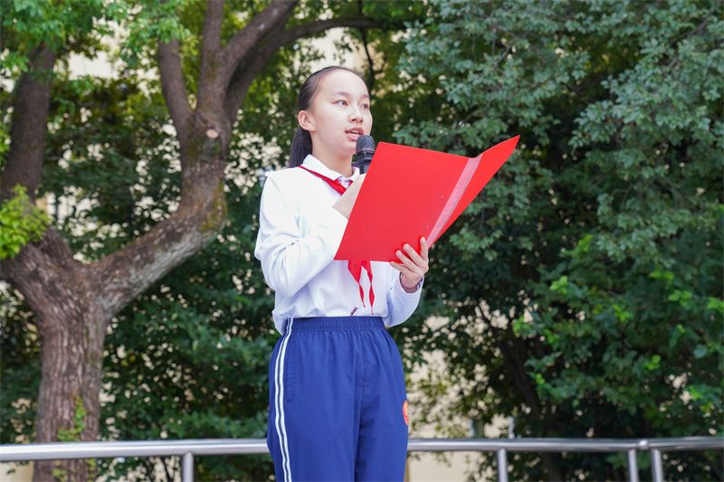 我是来自初二1班的薛旻喆。金秋十月,我们即将迎来新中国成立76周年的光辉时刻,同时也将共庆上海中学建校160周年华诞。在这双喜临门的特殊时刻,能作为初二1班的一员在此发言,我心中充满荣幸与激动。