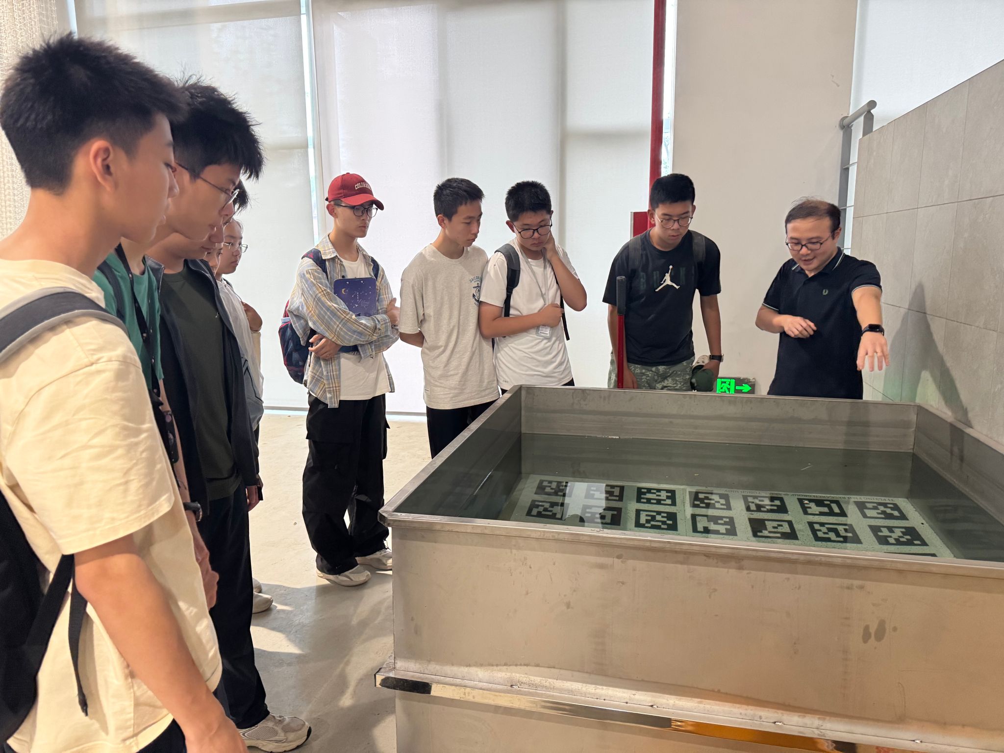 科学中心一楼的大型试验场地虽仍在完善中,却已展现出宏大的科研布局。引进的十余台宇树机器人阵列整齐,角落处特制的渐变深度水池配合池底二维图案,正为水空两栖无人机的识别与测试提供重要平台,令同学们对跨介质智能装备的研发有了直观认识。