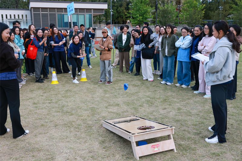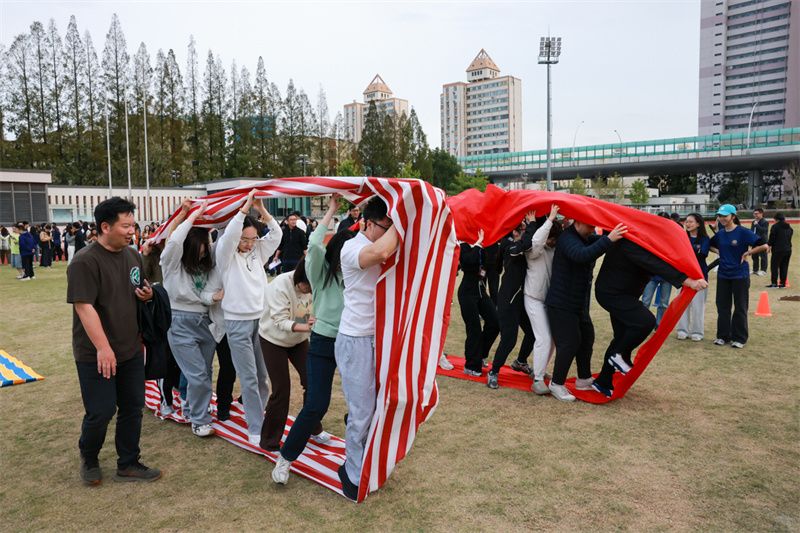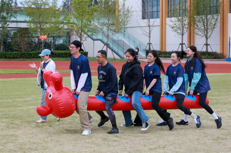 竞速毛毛虫现场,教职工们六人一组跨骑在彩色充气毛毛虫身上,双手紧扣把手,伴随整齐口令在草坪上飞驰。篮球冰淇淋项目,教职工需用标志桶将篮球逐一传递。表面轻松,实则对力度与方向要求极高,个人与团队的协作缺一不可。