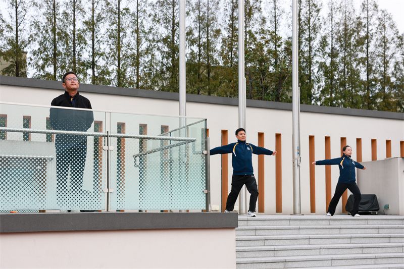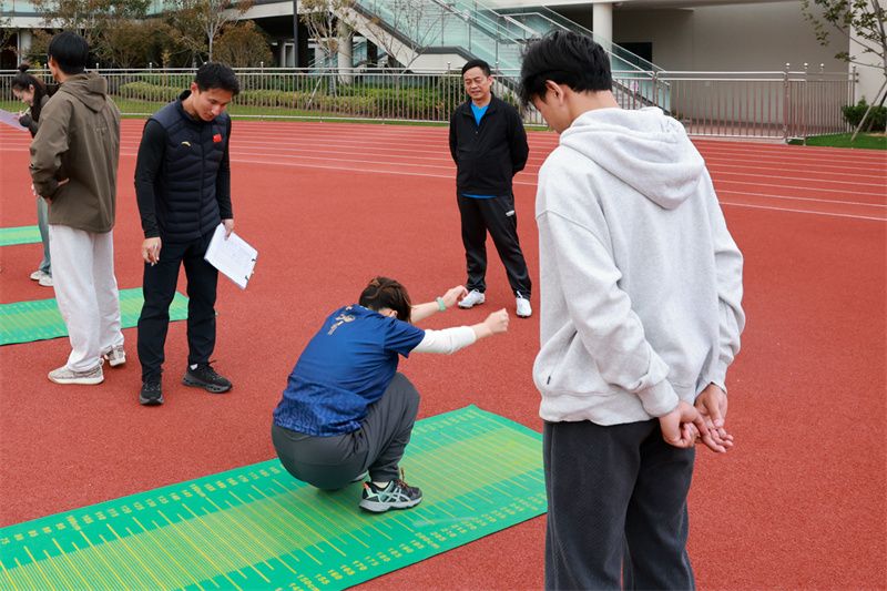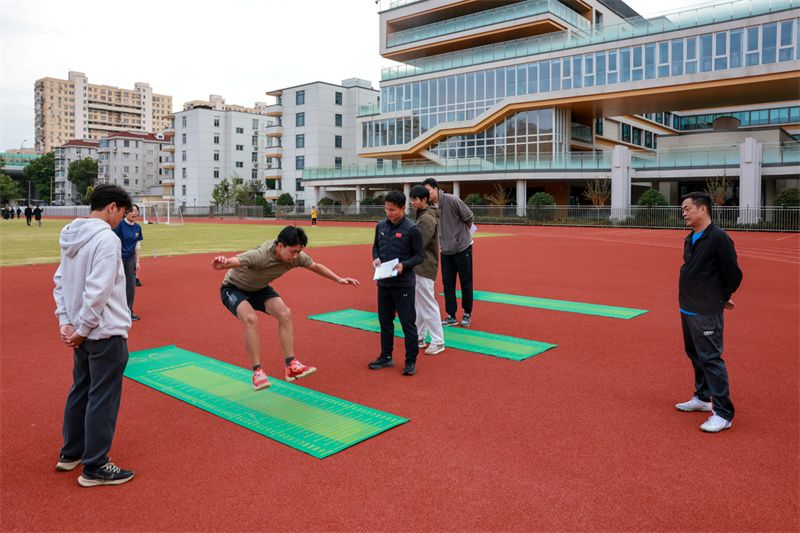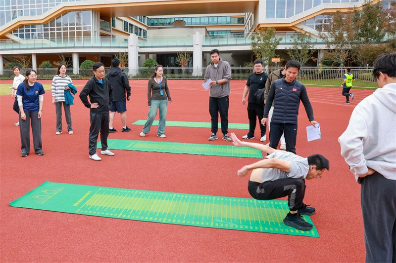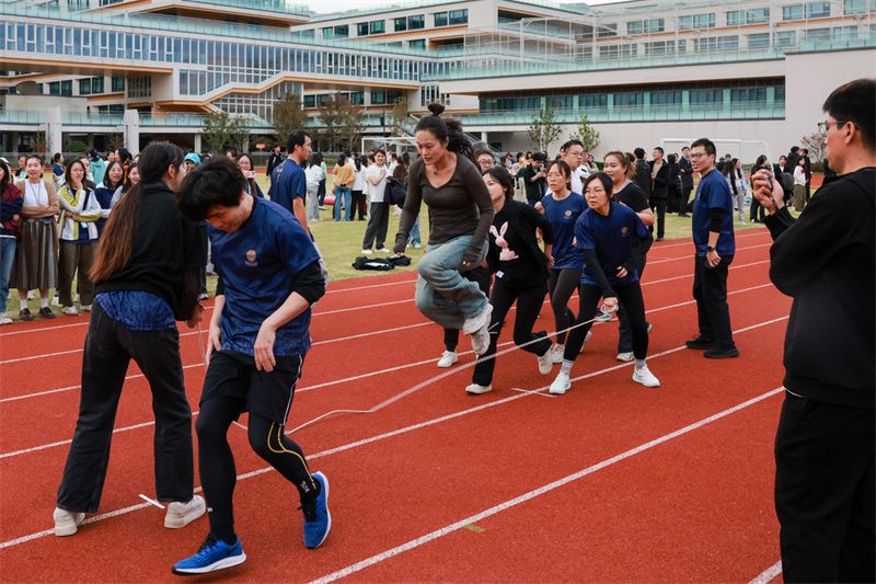 无敌风火轮被誉为“最默契”项目。8人脚踩彩色履带,喊着口令齐步前进。履带在草地上缓缓滚动,队员必须保持相同步幅,履带尾部冲线的一刻,掌声与欢呼响彻操场。老师们在立定跳远区域前站定,双臂后摆、屈膝、蹬地、腾空、收腿、落地,动作一气呵成。