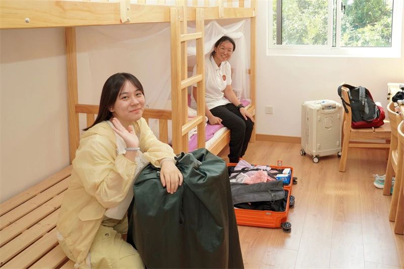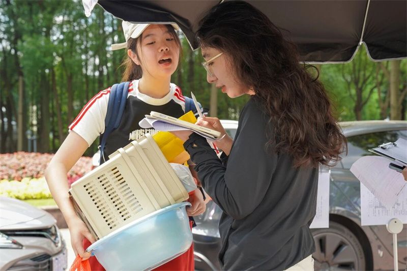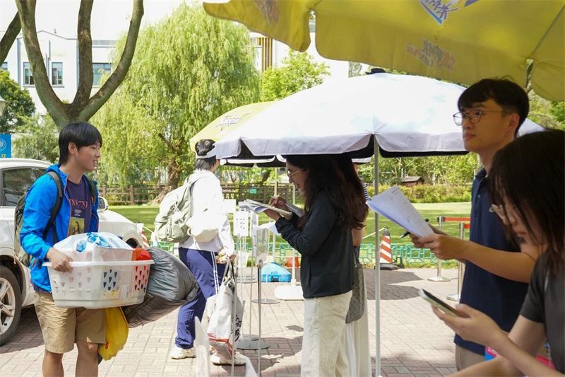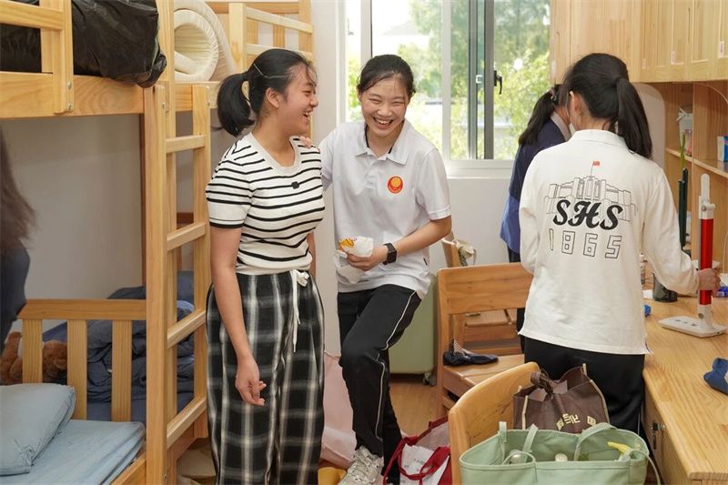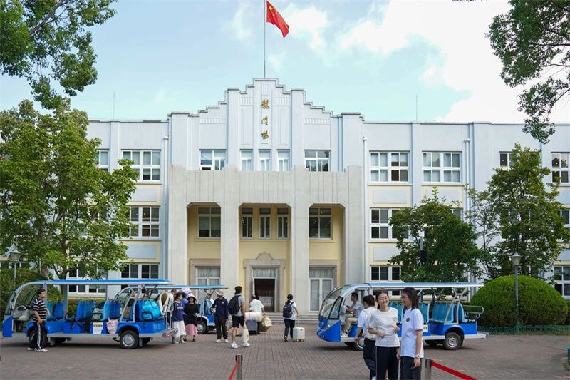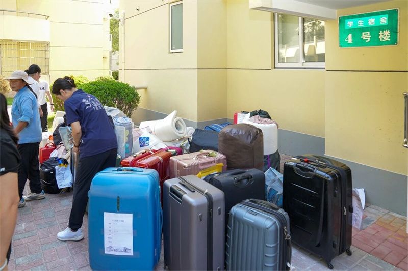 学校安排多辆校园接驳车往返于校门与宿舍区之间,工作人员协助学生搬运行李,保障学生安全便捷抵达宿舍。住宿生有序进入寝室,随后自行整理个人物品、打扫布置宿舍。