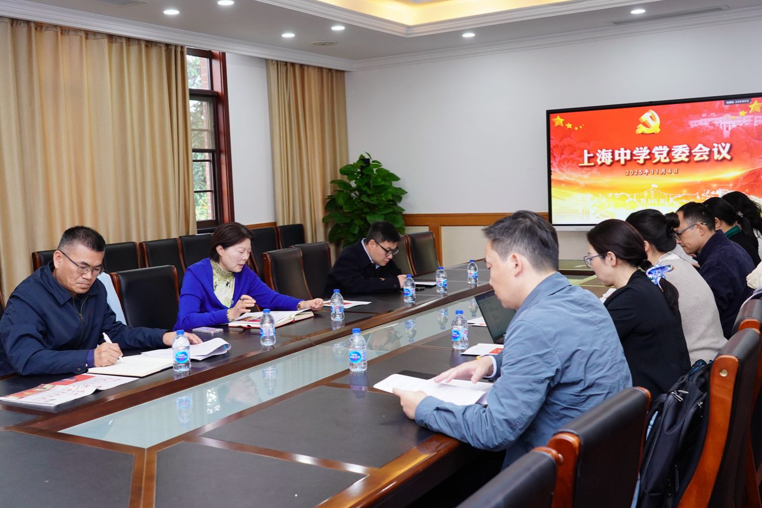 2025年11月4日,上海中学于校内召开11月党委会议,会议由党委书记张泽红主持,党委副书记樊新强、党委副书记刘茂祥以及全体党委委员参会,重点围绕“十五五”规划要求、党组织建设规范及教育教学实践落地展开研讨。