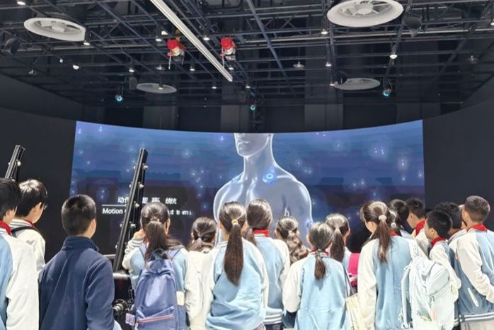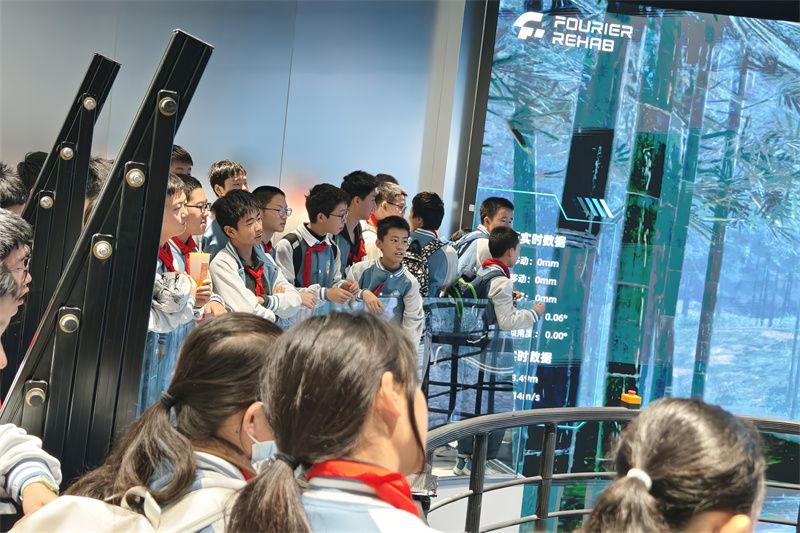 讲座结束后,同学们在莫老师的带领下,来到叙事融合腿足机器人训练场。这里的人形机器人训练平台令人眼前一亮,它能够精准模拟乘船、穿越树林、外星之旅等多种复杂环境,通过视觉场景变化与地面移动模拟,为机器人训练提供高度仿真的条件。这项技术不仅应用于机器人研发,还延伸到康复训练、赛车模拟等多个领域,同学们驻足围观,近距离观察平台的运行原理,不时与同伴交流感受,对科技的神奇魅力啧啧称叹。