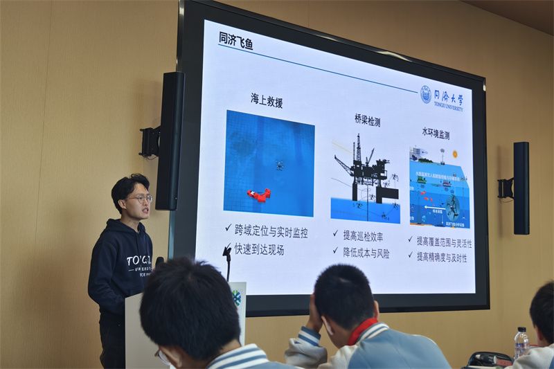 王博士详细梳理了多旋翼无人机的发展脉络,从最初的休眠期、复苏期,到逐步发展的发展期、活跃期,再到爆发期、回调期,直至如今的爬升期,清晰展现了这项技术从萌芽到成熟的演进历程。他还结合生活实例,介绍了无人机在国内的多元应用场景,无论是美团外卖的便捷配送、民间表演的精彩呈现,还是国防领域的军用部署,都让同学们感受到无人机技术与生活的紧密联系。最后,王博士聚焦同济大学自主研发的“同济飞鱼”无人机,深入讲解其核心技术与创新亮点。