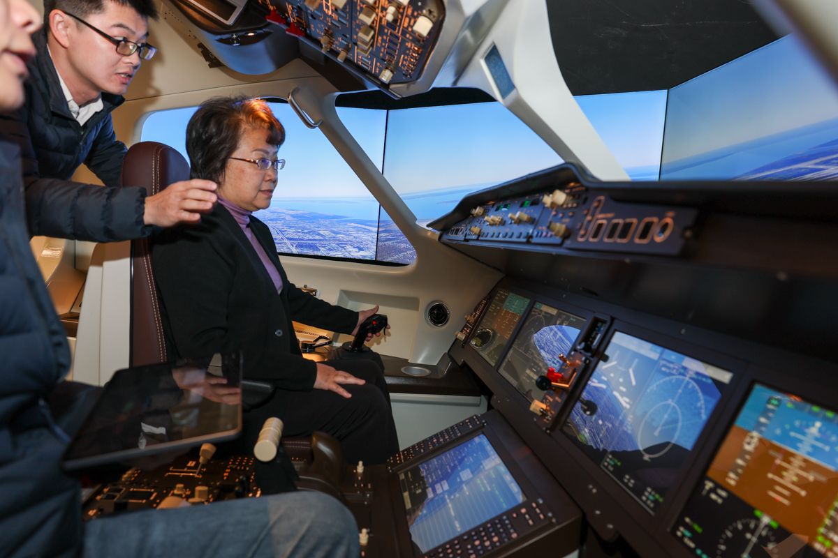 (翁铁慧同志和郑泉水院士分别试驾体验C919模拟驾驶舱)