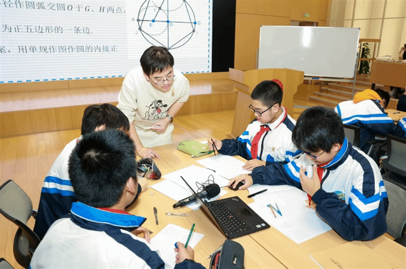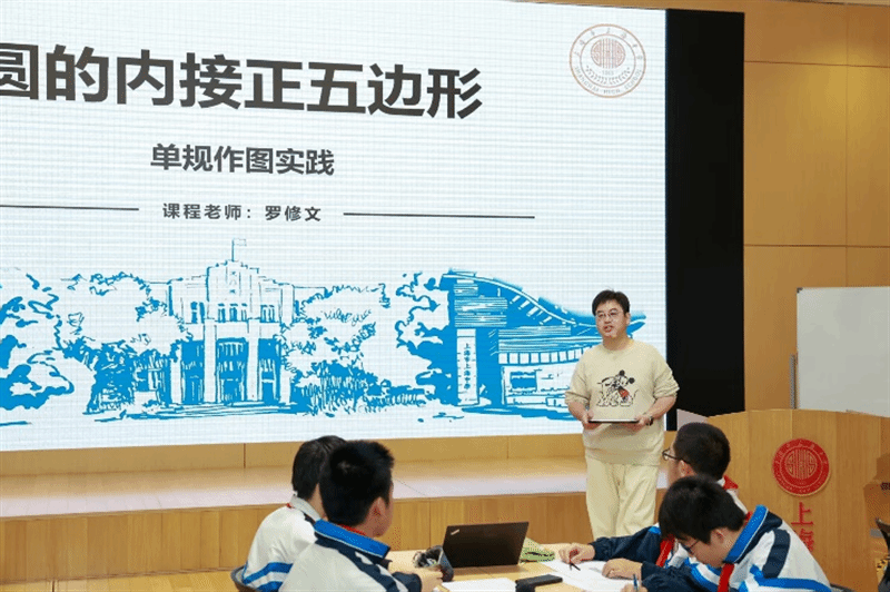 活动伊始,上海中学罗修文老师带来 “单规作图” 展示课。在初三(1)班的课堂上,学生们在已掌握尺规作图基础上,分组探究圆内接正五边形的单规作图方案。课程通过 “设计 - 实践 - 展示” 的完整探究路径,引导学生在 “失去直尺” 的限制下,以 “圆的交点” 替代 “线与线的交点”,实现从尺规到单规的能力迁移,深刻体会几何问题的本质规律,有效发展了逻辑推理与数学抽象素养。