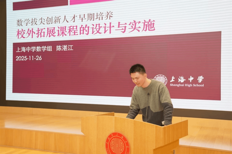 在项目报告与论坛环节,上海中学教师团队分享了多元培养实践。王永庆老师介绍了《国际视野下数学拔尖创新人才早期培养之 “探究・创造” 实践模式研究》项目,该校构建了基础课程、校内拓展课程与校外课程相辅相成的培养体系,通过问题驱动、容错试错等策略,破解学生思维深度不足等难题,未来将重点总结课程案例与培养路径。陈湛江老师详解了校外拓展课程的创新实践,该课程采用中美双师协同模式,由美国前奥数国家队教练线上主讲、校内教师线下配合,通过双语授课、“探究 - 精讲” 循环模式,提升学生数学英语素养与创新意识,实现跨国课堂的高效互动。