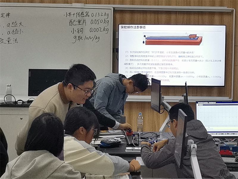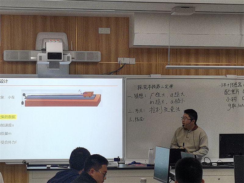11月26日,尹云鹏老师在逸夫楼DIS实验室开展了《探究物体加速度和物体质量的关系》公开课。本节课的主要内容是通过定量的DIS实验探究在物体所受合力不变的情况下加速度和质量的关系,要求学生运用数字化信息系统测量实验数据,并通过逻辑推理分析得到实验结果。