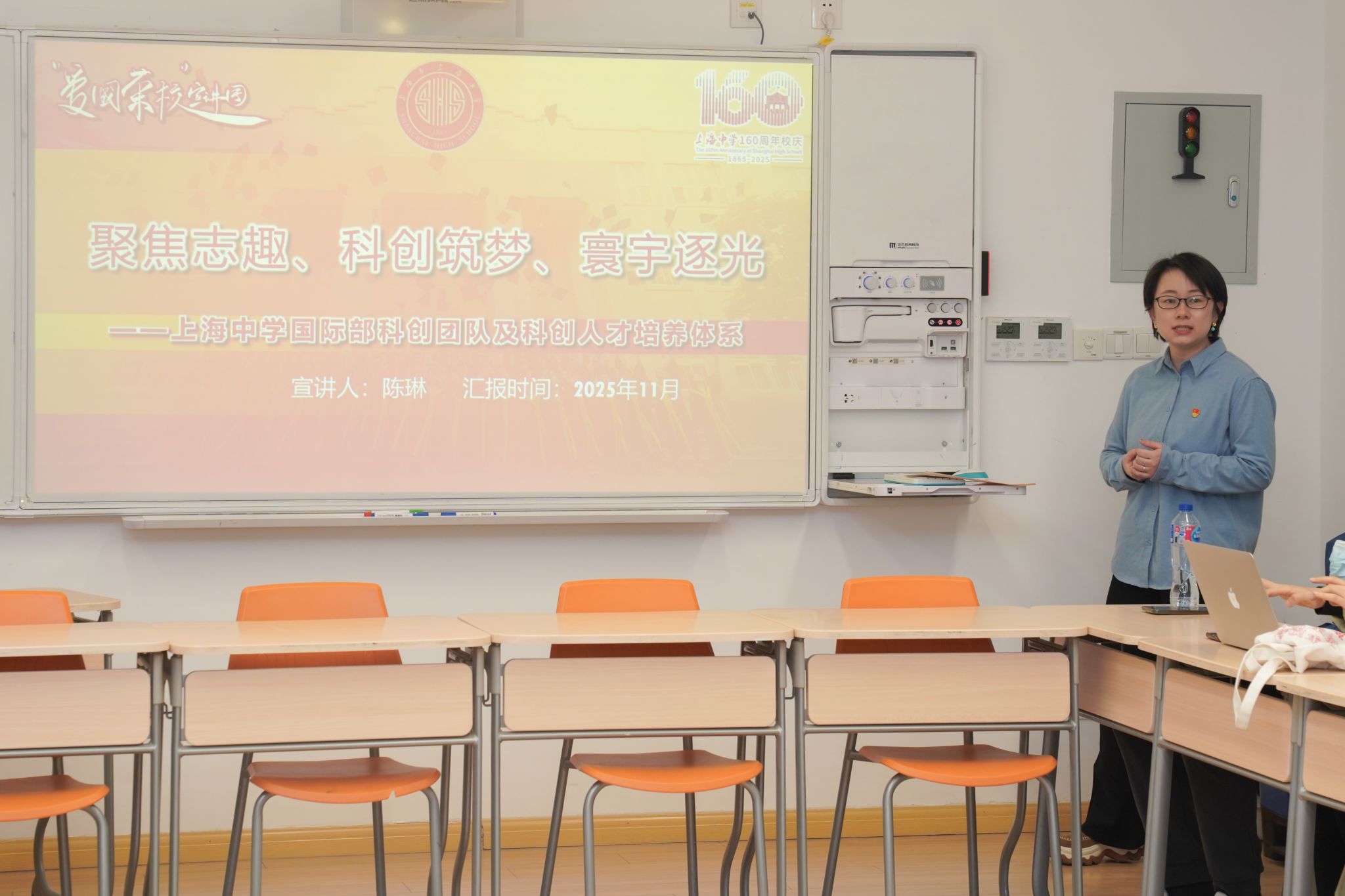 国际部第三支部陈琳老师以“聚焦志趣、科创筑梦、寰宇逐光——上海中学国际部科创团队及科创人才培养体系”为题,阐述国际部高中段科创教育实践。她引用习近平总书记“科技创新、科学普及是实现创新发展的两翼”的重要论述,强调科创团队以“点燃终身探索的热情”为目标,从多维度课程建设、协同合作团队培养、科创竞赛支持机制及校内外资源衔接机制四方面构建人才培养体系。通过每周邀请院士、高校教师及科技工作者进校园开设固定课程,成立学术导师团,为学生提供综合实践与研究性学习平台,助力青少年科创能力提升。