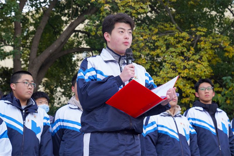 宣誓结束后,新团员代表、高三(3)班乐澄毅同学发表入团感言。他表示,对高三学子而言,入团不仅是青春的光荣,更是冲刺路上的责任。“共青团员”的身份不是口号,而是自修精进时的专注、面对挫折时的韧劲、同学间互助时的真诚。作为即将奔赴考场的高三学生,他倡议与全体新团员一同践行“以格物致知之心,穷卷帙浩繁之理;以兼济天下之情,担民族复兴之任”,将入团誓言融入晨读书声、错题本与每一次认真听讲中,既做奋力冲刺的考生,更做心怀国之大者的共青团员,不负团的嘱托、学校的培养与青春征程,并积极向党组织靠拢,将个人发展与国家命运紧密相连。