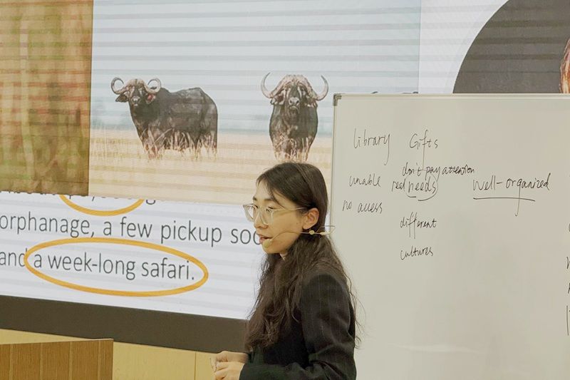 随后,上海中学范凌与老师带领上海中学高二6班的学生,带来了上外版选择性必修一第二单元第三课时的教学展示。范老师首先带领学生讨论“高中生愿意主动参与的志愿服务活动”的主要特征,激发他们对成功且有吸引力的志愿服务活动的理解与期待。然后,引导学生根据预习作业复述作者的坦桑尼亚公益旅行,把握语篇主要内容。接下来,范老师组织学生细读作者遭遇尴尬处境的原因,引导学生分析语篇内容和语言细节,认识参与者与受助者之间的文化与需求差异,理解志愿服务前期调研的必要性,以及了解受助者真实需求的重要性。随后,范老师激发学生持续反思作者的公益旅行,深入思考,从项目组织者和设计者的视角出发为公益旅行提供改进建议,并总结不同视角下的项目设计关键考量因素,形成志愿服务活动设计的全局视角。