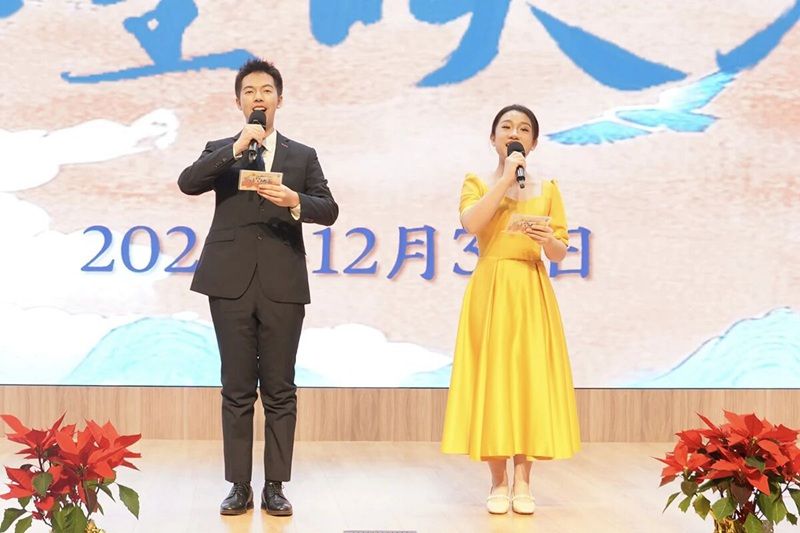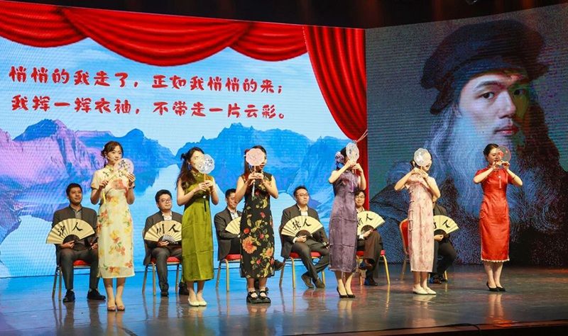 当晚,平日里在讲台上传道授业的老师们褪去严肃模样,化身舞台上的 “男神女神”,带来节目《致每一座心中的康桥》。女教师们身着旗袍尽显优雅风韵,男教师们巧用方言增添幽默趣味,共同重新演绎经典诗篇《再别康桥》。从一方书案到星光舞台,变的是场景,不变的是深沉的师者情怀。