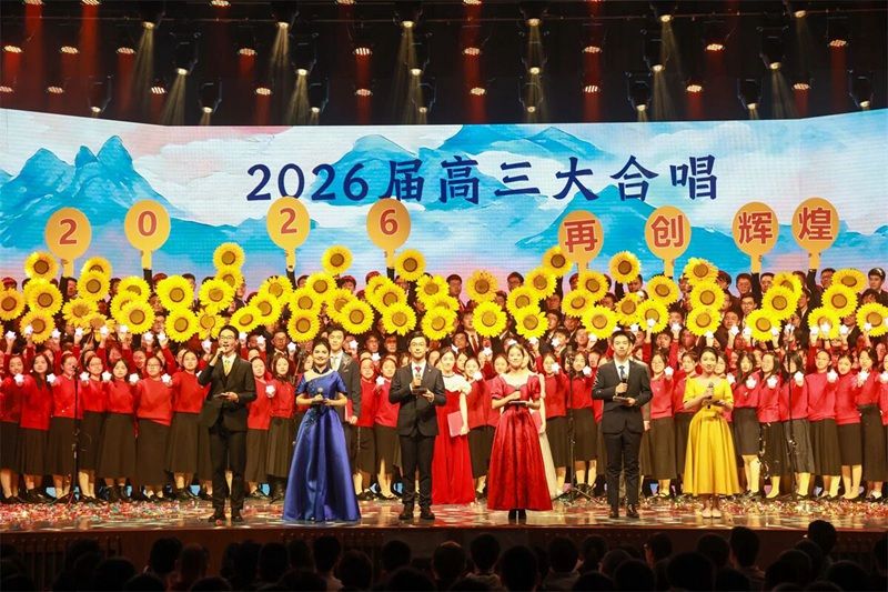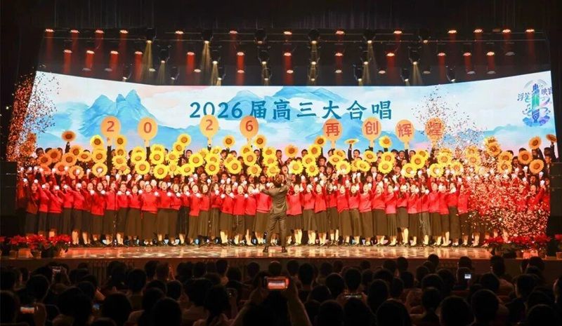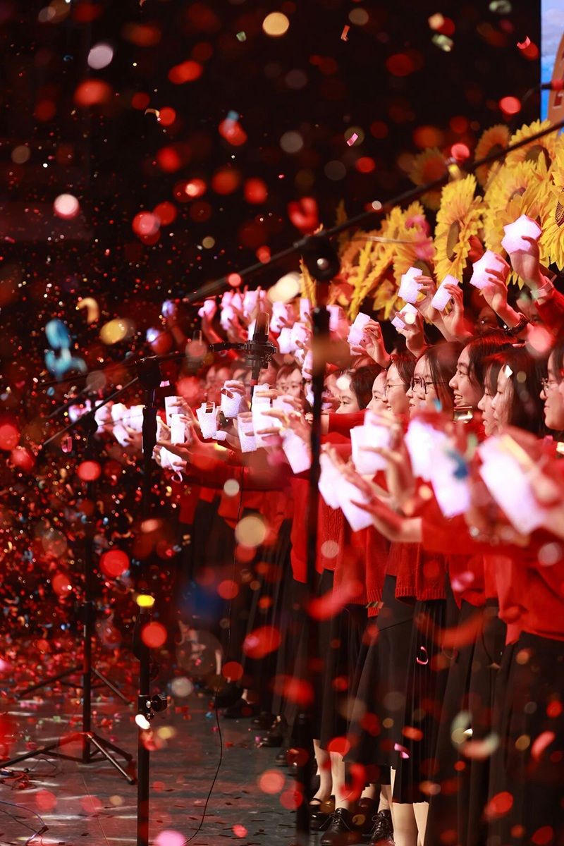红色幕布缓缓拉开,高三大合唱震撼登场,全体高三学子以嘹亮歌声抒发青春情怀。《再见深海》的旋律流淌,传递着青春里的温暖与感恩;《感恩》娓娓道来,诉说着成长路上的深刻感悟;《追光在路上》激昂奋进,彰显着少年的昂扬姿态;《你在,我们不忘》温情脉脉,致敬百年校魂与师者恩情。诗朗诵与歌声交织共鸣,既彰显了龙门学子的逐梦热忱,也诠释了百年上中的精神传承。高三学子们以真挚的情感、昂扬的姿态,为自己的高中时光留下了浓墨重彩的一笔。