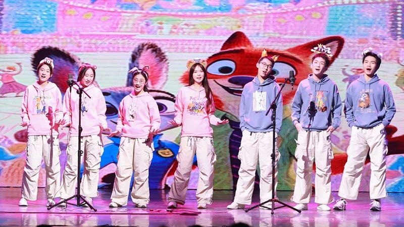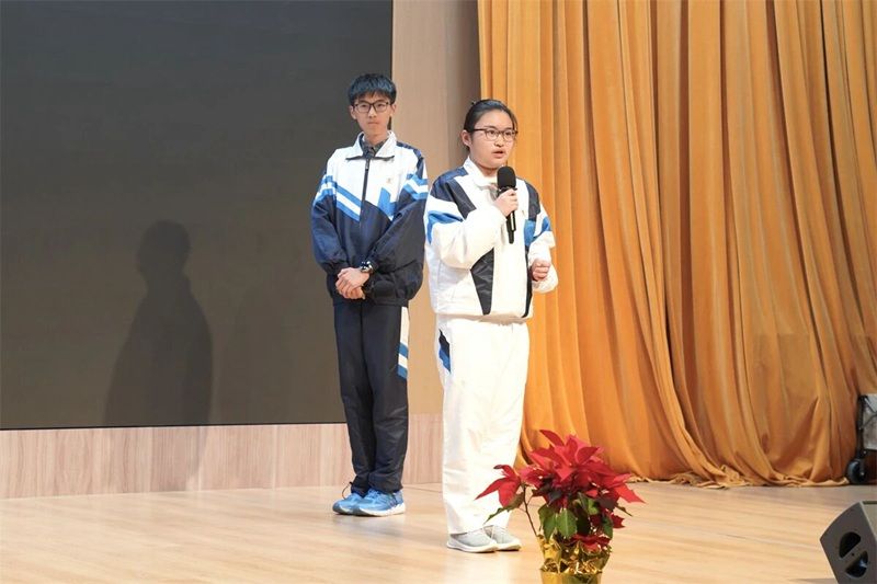 校合唱团、高二(5)班、高二(1)班带来组唱串烧:《世界赠与你的》吟唱生活中的美好确幸,《Try Everything》奏响无畏前行的战歌,《青春乐园》记录成长路上的点滴时光,三首耳熟能详的歌曲将不同心境化作动人旋律,生动展现了成长旅程中的无限惊喜。