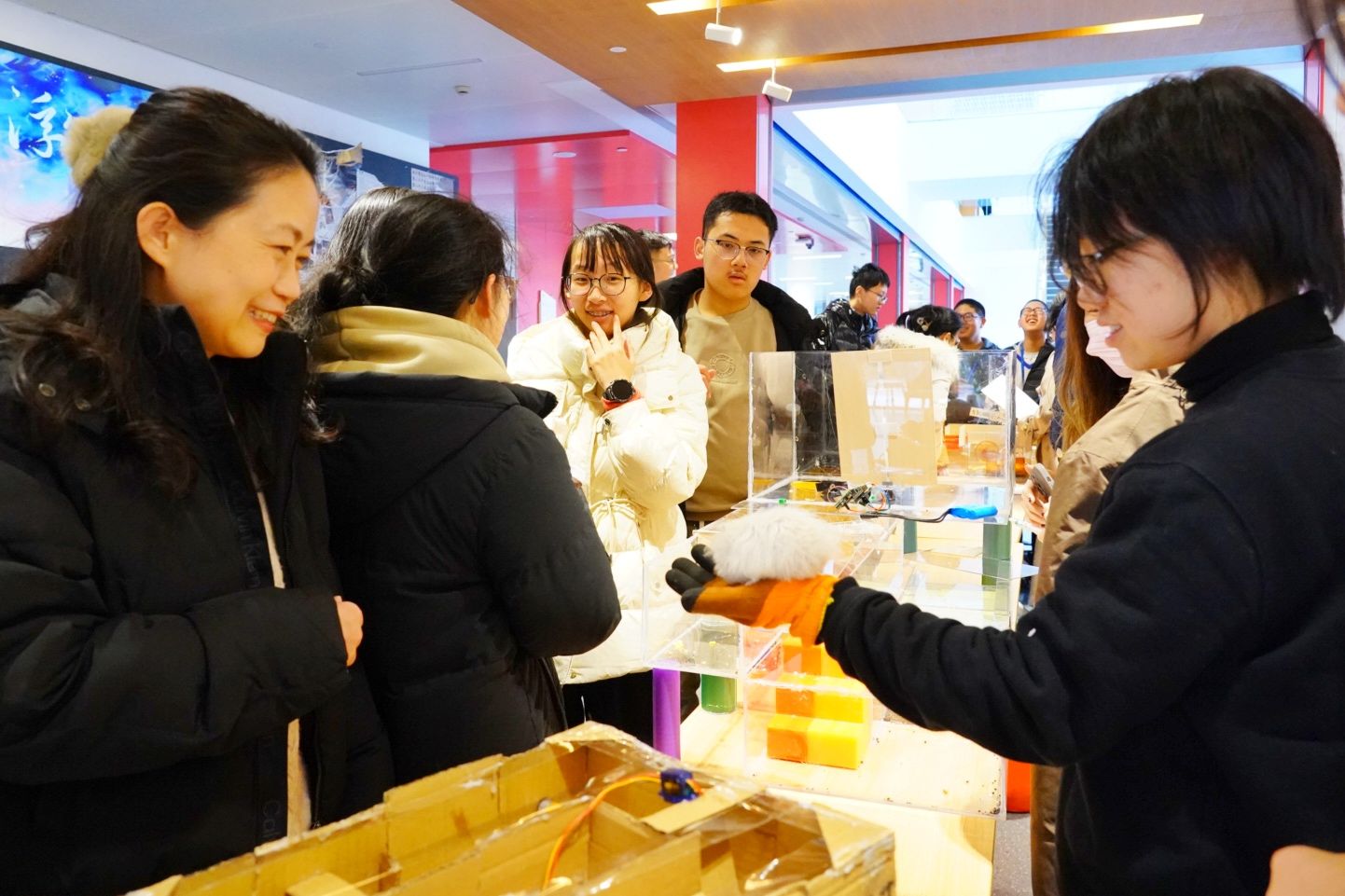 2026年1月8日中午12:40,上海中学STEM课程“智能产品设计与制作”的“仓鼠迷宫”比赛在甄陶楼一楼大厅精彩上演。活动现场展示了由高二学生团队历时一学期设计制作的四个“智能仓鼠迷宫”,并进行了紧张有趣的现场走迷宫比赛。