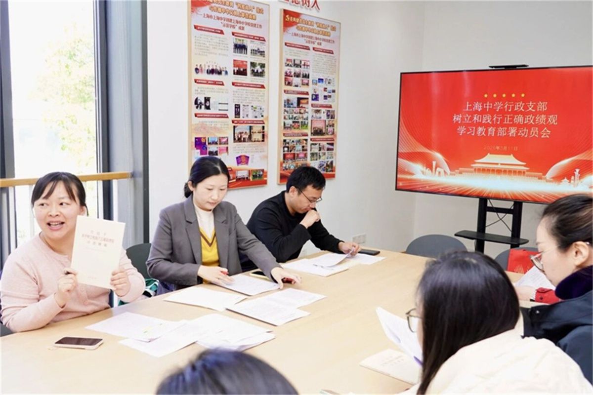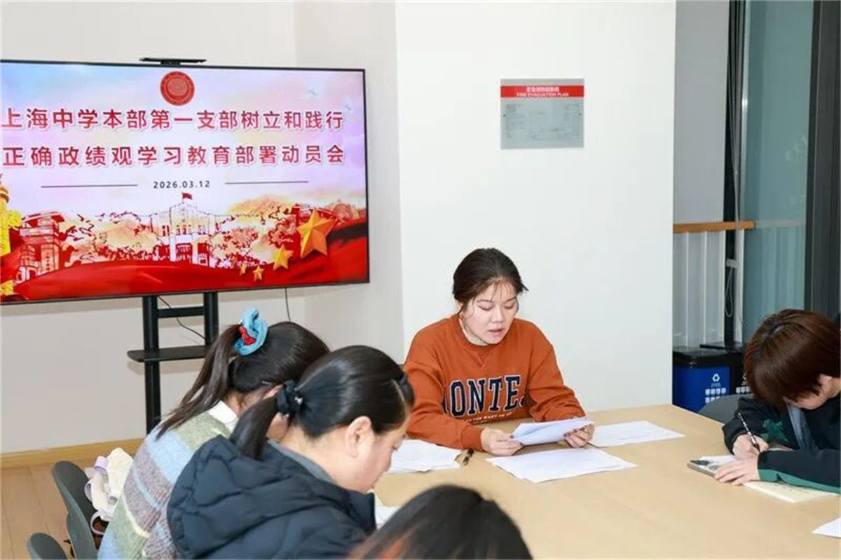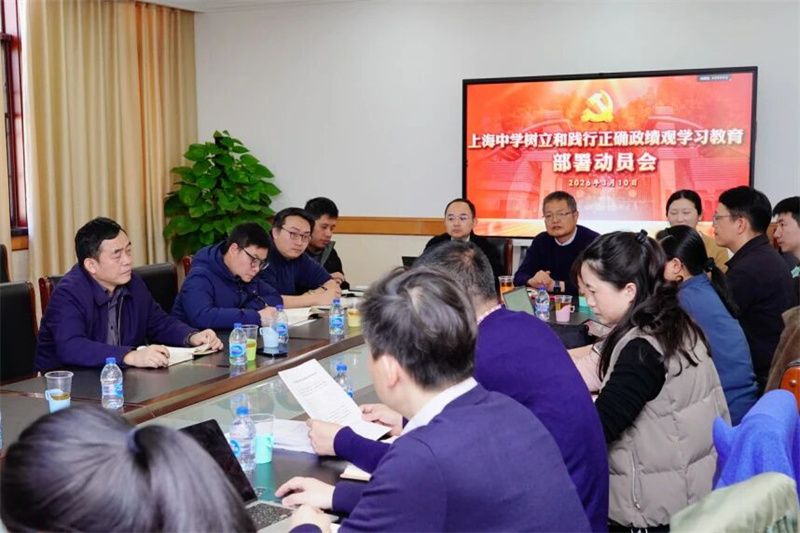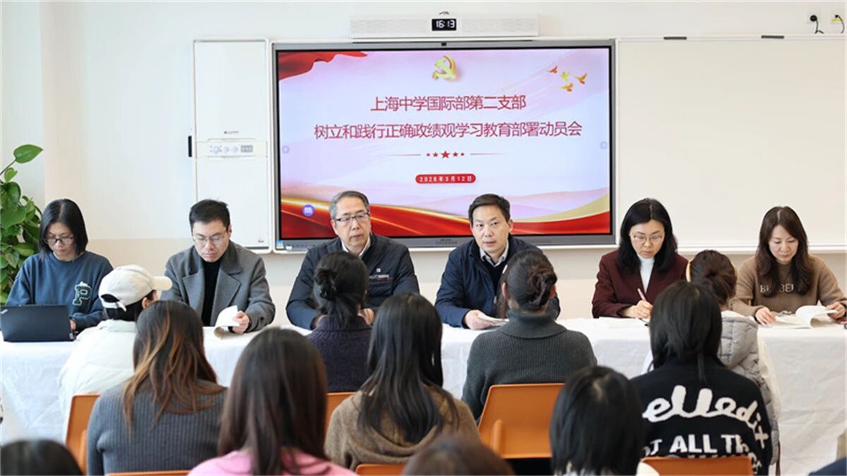 树立和践行正确政绩观学习教育在上海中学党委领导统筹部署下分层推进。2026年2月26日至3月13日期间,学校党委召开会议明确学习教育的总体方向、核心要求和推进步骤,筑牢制度基础、凝聚思想共识;召开部署动员会强调要将正确政绩观贯穿办学治校、教书育人全过程,发挥引领作用,推动学习教育落地见效;召开党委理论中心组专题学习会,围绕正确政绩观、纪律建设等核心内容开展学习,深入探讨如何将正确政绩观学习与立德树人根本任务相结合,以实干实绩推动学校高质量发展。