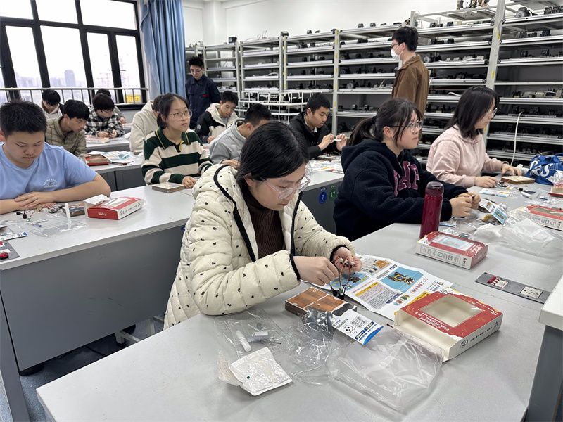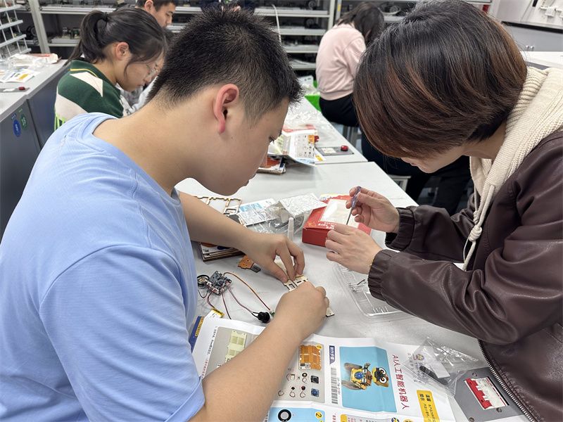 另一组同学在“智械造物”AI智能机器人课堂中,同学们化身AI智能系统实施工程师,开启了一场从零到一的智能创造之旅。课堂上,大家根据老师的一步步讲解,用螺丝刀将散落的部件一步步组装成完整的机器人骨架。在活动过程中,来自工业技术学校的志愿者同学们也在一旁为我们答疑解惑。