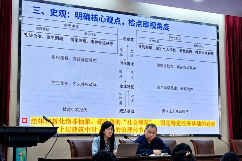随后,顾老师以选必一第8课《中国古代的法治与教化》为例,展示了借助典型事例、构建教学逻辑的教学实践过程。顾老师用春秋子产铸刑书与叔向诘难、西汉甲误伤其父案、唐代徐元庆复仇案、以及北宋《吕氏乡约》和清代“合律乡约”对比的四个典型事例,梳理了由先秦德法之争、汉唐援礼入法至宋以后约律结合的历史脉络,引导学生从中得出中华法系“礼法结合、德主刑辅”的鲜明特征。最后,顾老师引导学生思考中国古代礼法关系不断变化与经济基础变革的关联,进而明确本节课的核心观点——法律与教化绝非抽象、超阶级的“社会规范”,而是特定经济基础的必然结果,紧扣历史核心素养,加深学生对唯物史观的理解。