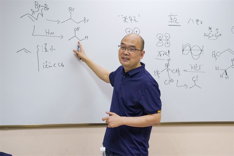最后,孙兴文教授延伸介绍了炔烃的相关知识及自由基加成反应,帮助同学们补充完善了有机化学知识体系。同时,孙教授分享了科学家在合成聚乙烯过程中的成败经历,以真实案例激励同学们,鼓励大家在学习和生活中积极观察、主动探索,善于发现有价值的科学现象,将所学知识与实践结合,让科学探索的成果成为自己成长路上“书架”与“货架”上的宝贵财富。
