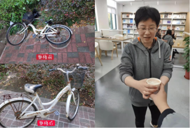 行政支部好人好事也在平时的小细节中充分展现。学校环境优美,绿化丰富,楼与楼之间有较长的距离,自行车是老师们来回课堂的必备工具。俞政老师帮助教师整修自行车,让教师更有效的完成教学过程,为他点赞。英姿老师为精神疲惫的教师准备了一份爱心咖啡,让爱心传递。
