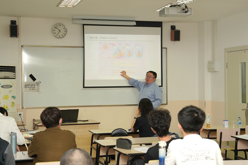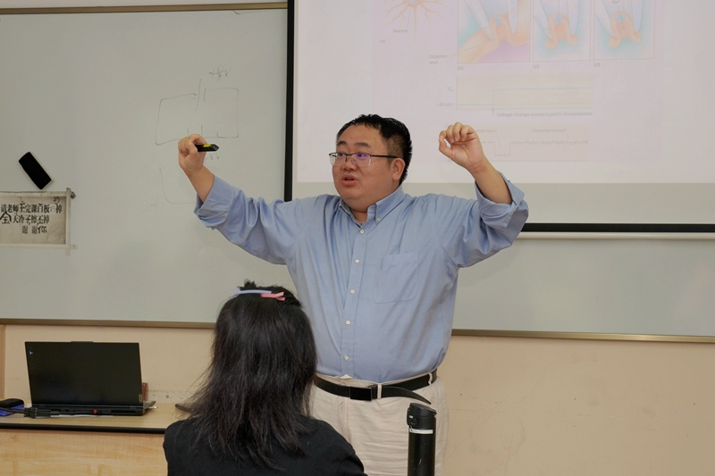 2023年10月29日晚,薛磊教授首先向同学们进一步介绍了对参与动作电位的各离子通道的研究方法,特别是使用各种阻断剂对于离子通道的影响。薛教授通过丰富的案例,向同学们介绍了利用TTX(河豚毒素)研究钠离子通道参与的各类神经生理过程,带领同学们设计相关实验,加深了对于实验设计的认识。