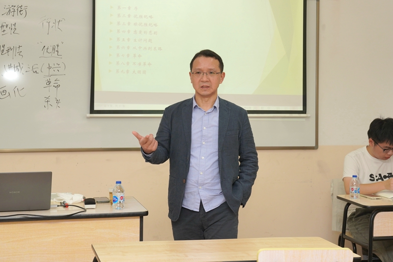 张教授首先请两位同学分享了自己对《阿Q正传》的看法,通过目录,大致了解了阿Q由“优胜”中兴到末路的历程,并引导同学们思考鲁迅笔下庄严文体中的一个不正常的、“漫画化”的人物,并探索其背后的历史社会原因。