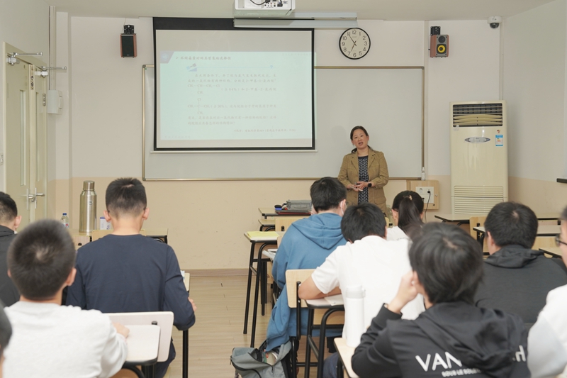 最后,张教授又介绍烯烃的加成反应。她带领同学们复习了烯烃中双键的顺反异构及其原理。随后,她分析这一反应的微观原理,得出其中马氏原则:“氢离子总是加在含氢离子较多的碳上” 。同时也强调,这是从实验中总结出来的规律。张教授还提及,实验中也曾观察到“反马氏原则”,并说明其结果都可以由反应中碳正离子的稳定性来解释。在氧化气氛下,有时实验出现马氏、反马氏原则并存的现象,这又引发人们对其中过氧化反应和自由基反应的研究,这体现对意外实验结果的解释也是化学进步的途径。