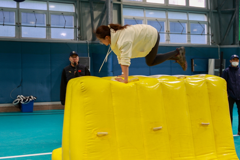 障碍接力中,教职工们依次踩过、爬过、穿过、翻过四个指定障碍物后跑回起点与队友击掌完成接力,彼此间配合默契。